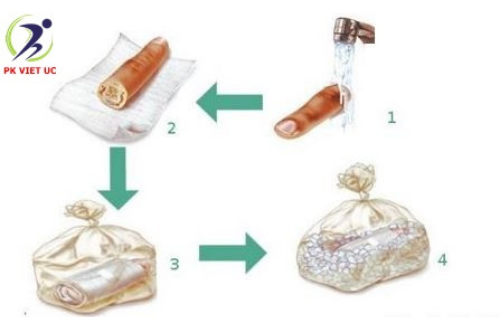 Quấn băng hoặc vải sạch quanh phần đứt lìa rồi cho vào một túi nhựa mỏng, buộc miệng túi lại.